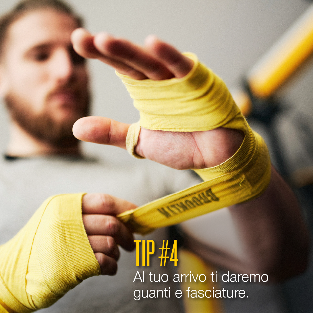 Ti daremo noi un paio di guantoni e fasciature che sono parte del tuo pacchetto Special Offer, compreso nella tua prima prova. Successivamente dovrai sempre averli con te ad ogni sessione. Se li dimentichi o li perdi, non preoccuparti, potrai sempre acquistarli da noi al club.